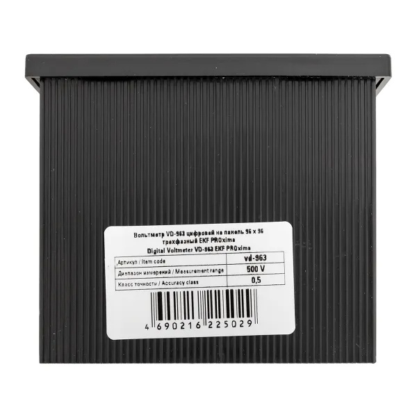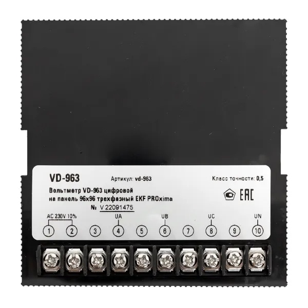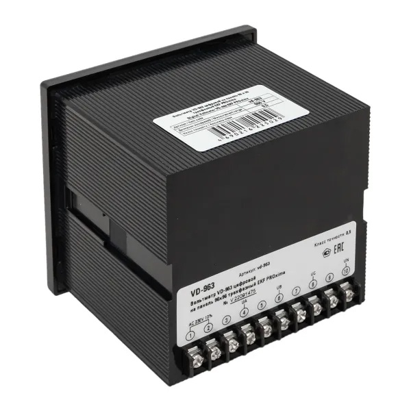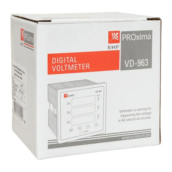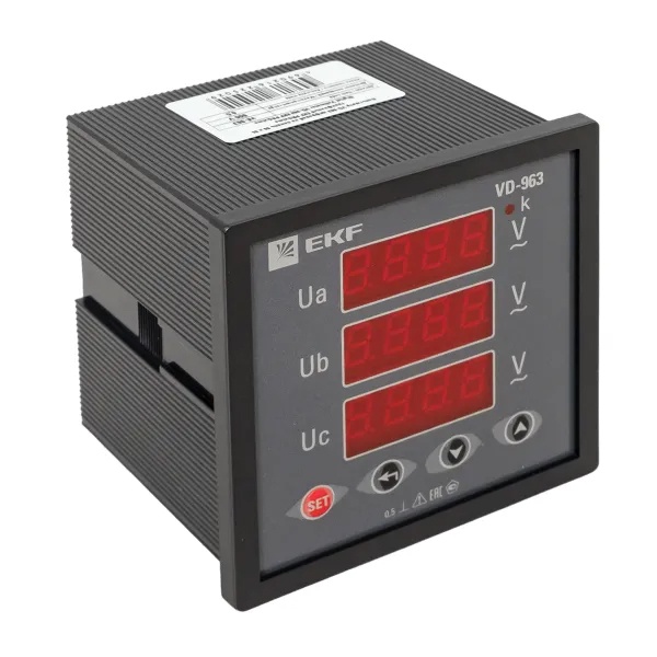 Цифровой трехфазный измеритель напряжения до 500В для щитового оборудования 96х96 EKF vd-963 Цифровые электроизмерительные вольтметры торговой марки EKF предназначены для точного измерения напряжения в электрических цепях переменного тока частотой 50/60 Гц. Приборы обеспечивают стабильный и достоверный контроль параметров сети и могут применяться как в составе локальных распределительных щитов, так и в комплексных системах энергомониторинга.