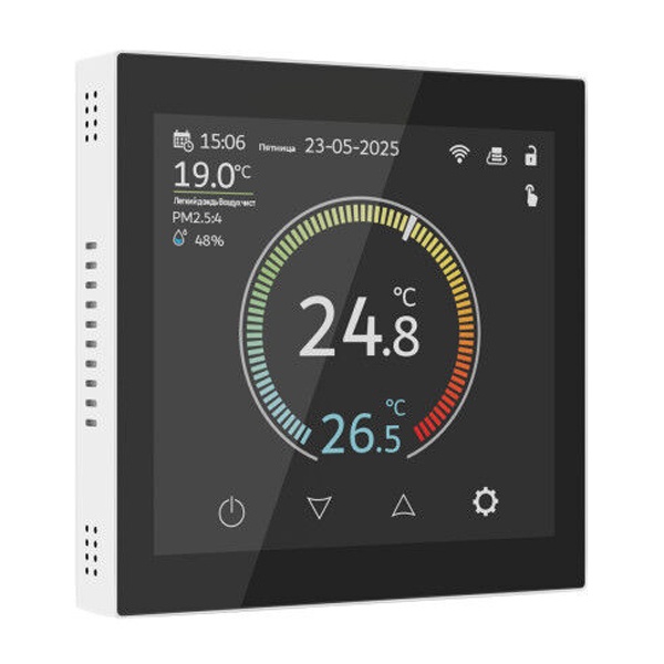 Терморегулятор выполнен в стильном безрамочном корпусе, который гармонично впишется в современный интерьер. Оснащён сенсорным TFT-IPS-LCD дисплеем с высокой чувствительностью и широким углом обзора, обеспечивая яркое и чёткое изображение при любом освещении.