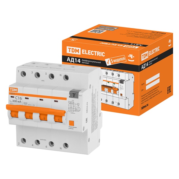 Четырехполюсный дифавтомат АД14 ТДМ, номинальный ток 16 ампер уставка С, дифференциальный ток 300 мА, шириной 5 модулей