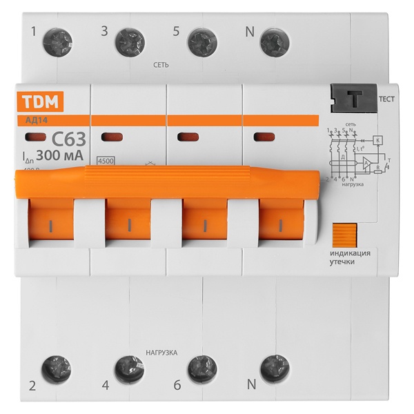 • Дифференциальный автомат TDM 4П С63А 300мА тип АС трехфазный электронный 4,5кА АД14 (дифавтомат, АВДТ)