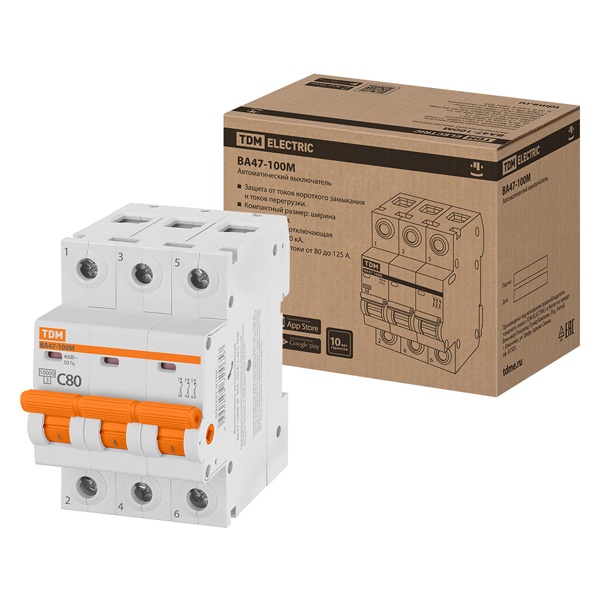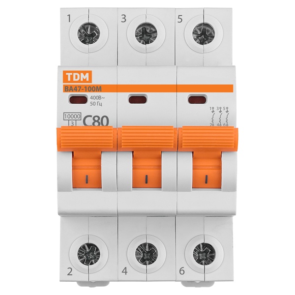 Выключатель автоматический TDM ВА47-100М 3Р С80А 10кА 3 модуля SQ0207-0106