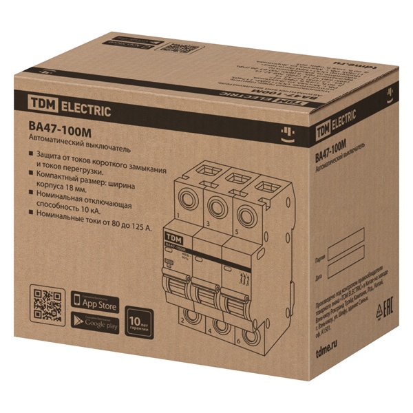 • Выключатель автоматический TDM ВА47-100М 3Р  С80А 10кА 3 модуля