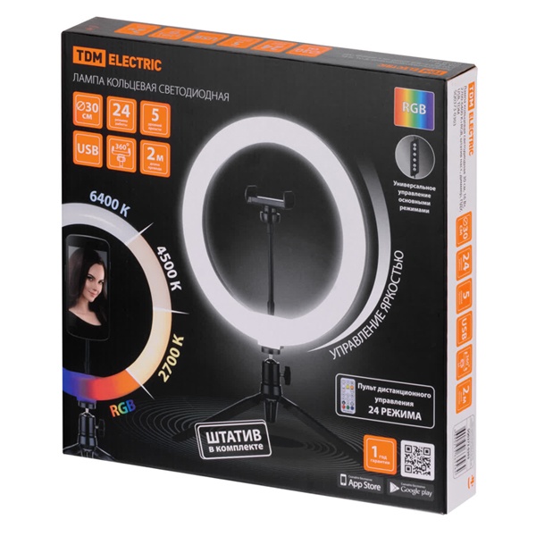 Настольная кольцевая лампа ТДМ на штативе для фото-видео съемок с регулировкой яркости, цвета и цветовой температуры, мощностью 16 Вт с дистанционным управлением, диаметр 300 мм SQ0373-0303
