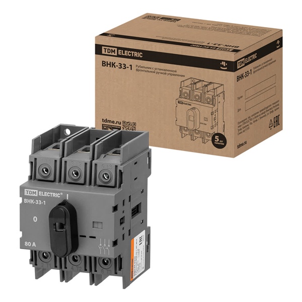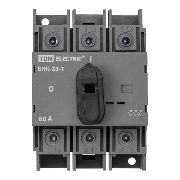 • Рубильник TDM ВНК-33-1 3П 80А с установленной фронтальной ручкой управления (выключатель нагрузки)