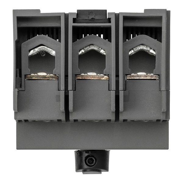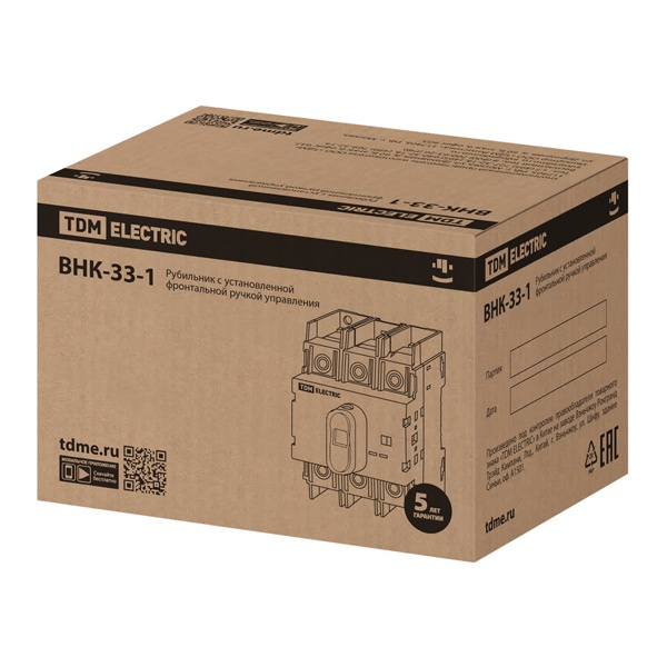 Трёхполюсный рубильник серии ВНК-33 предназначен для ручного коммутационного управления электрическими цепями переменного тока до 660 В и номинального тока до 630 А. Оснащён фронтальной ручкой управления, установленной на корпусе устройства, что обеспечивает удобство эксплуатации и безопасность при переключении.
