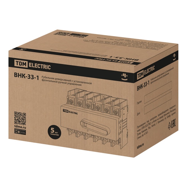 Реверсивный рубильник ВНК-33 на 3 полюса представляет собой коммутационное устройство, предназначенное для ручного включения, отключения и реверсирования (смены направления подачи) электрической нагрузки в сетях переменного тока. Модель оснащена фронтальной ручкой управления от бренда TDM, обеспечивающей удобное и безопасное управление переключением режимов.