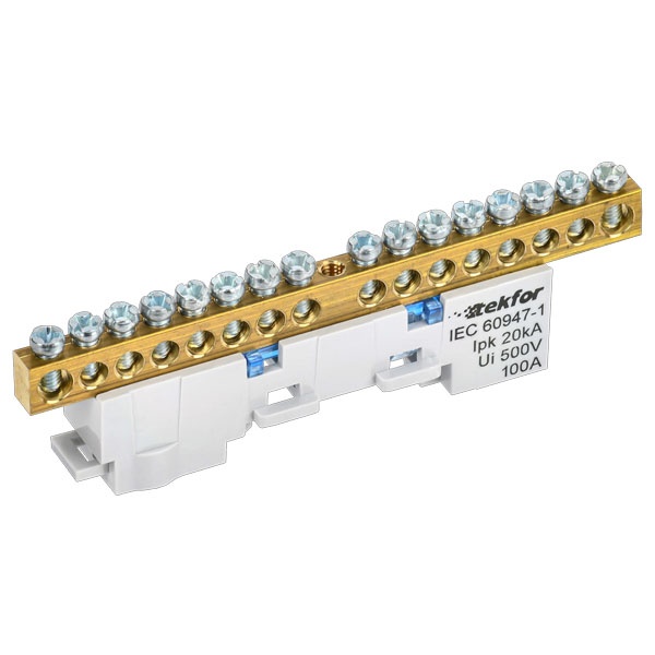 Нулевая латунная шина на дин рейку 16 выводов 100А TF-NN10-16-DL-K07