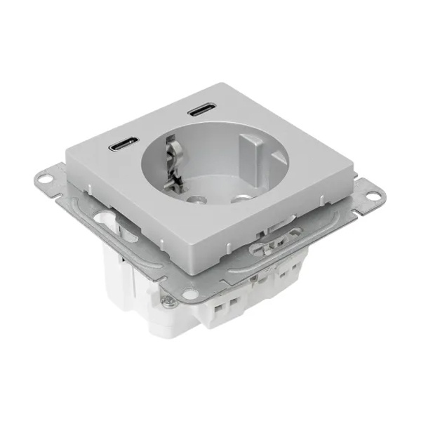 Электрическая розетка с заземляющим контактом, шторками и USB портами скрытой установки алюминиевого цвета, винтовое подключение ЕКФ Эпика UP1-SOA-111-2USBC
