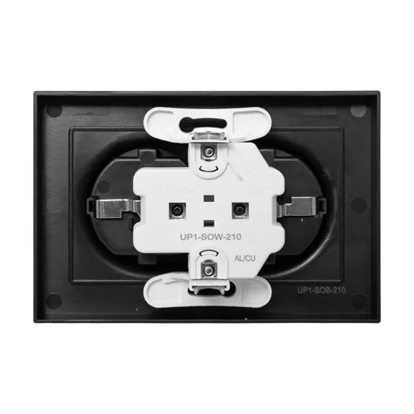 Универсальный механизм розетки совместим как с медной, так и с алюминиевой проводкой, обеспечивая надежное соединение и безопасную эксплуатацию.